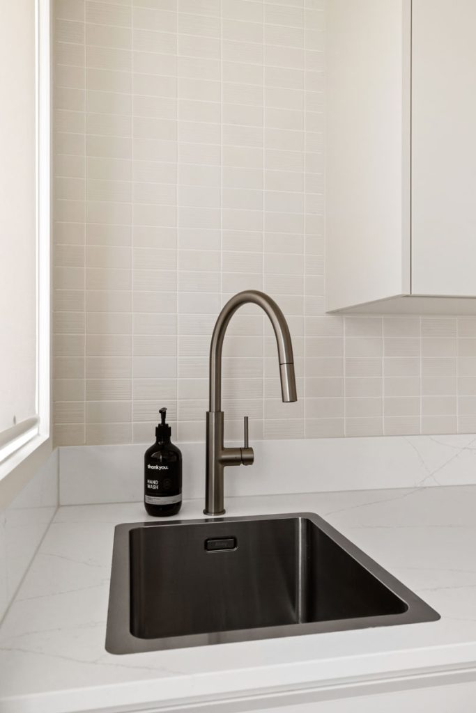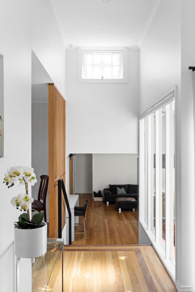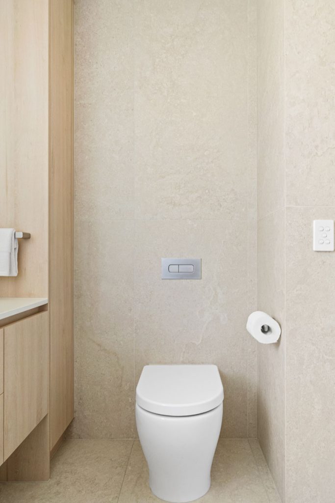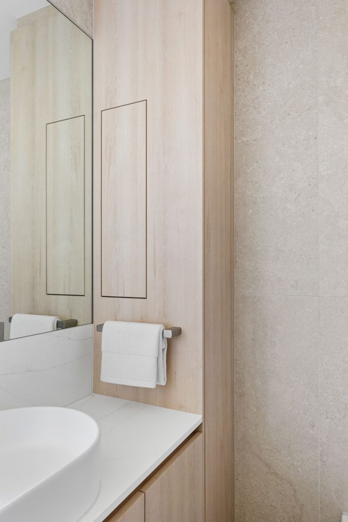 A custom timber slat barn door leads to the utility area, reconfigured to enhance flow. By closing off the existing toilet room, we were able to create a more functional division between the laundry and family bathroom, allowing for added storage while maintaining a sleek, minimalist aesthetic.
