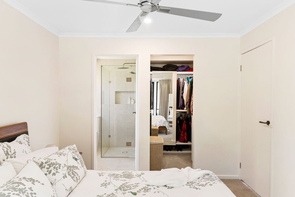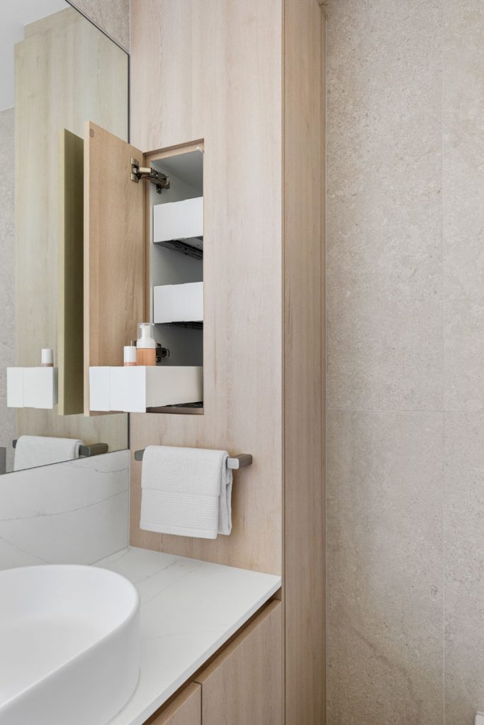 The walk-in robe was designed with ample hanging space, responding directly to the client’s needs, while a concealed sliding mirror enhances both storage and function.