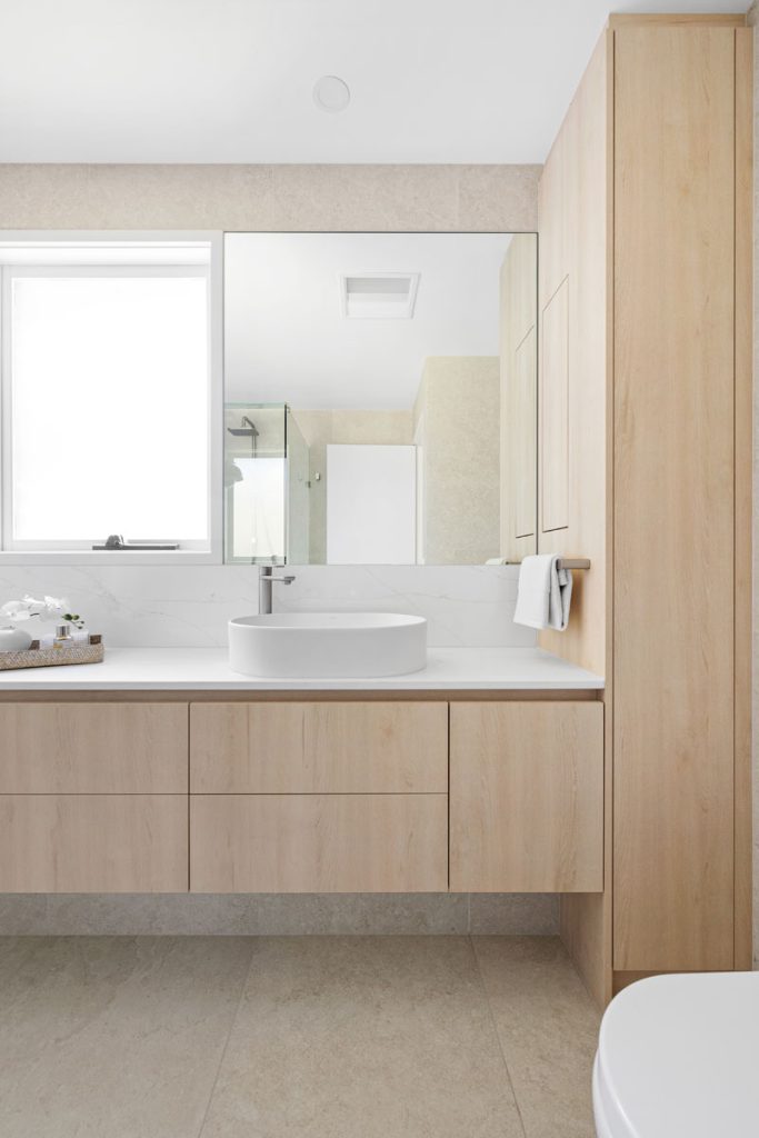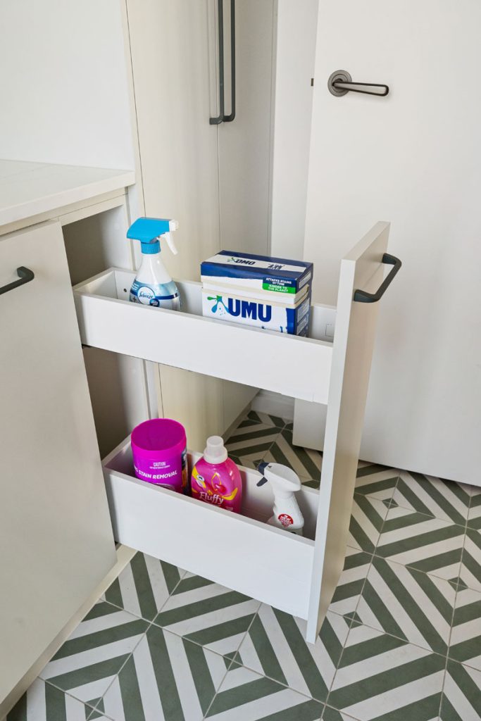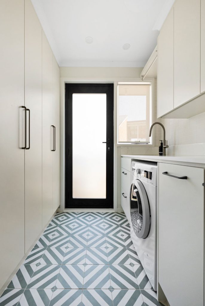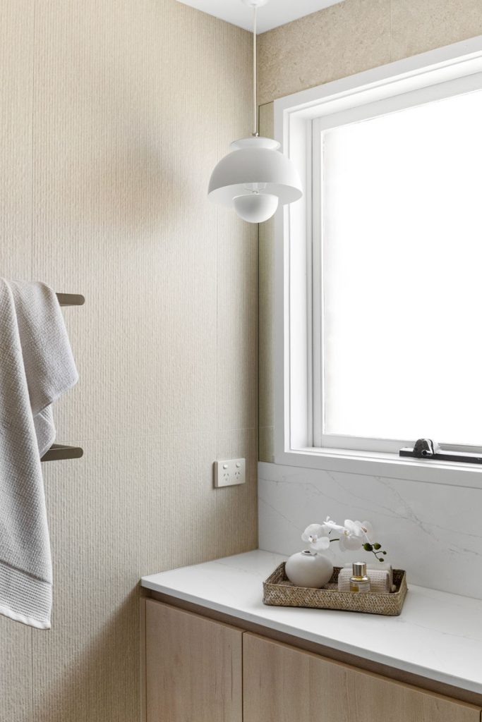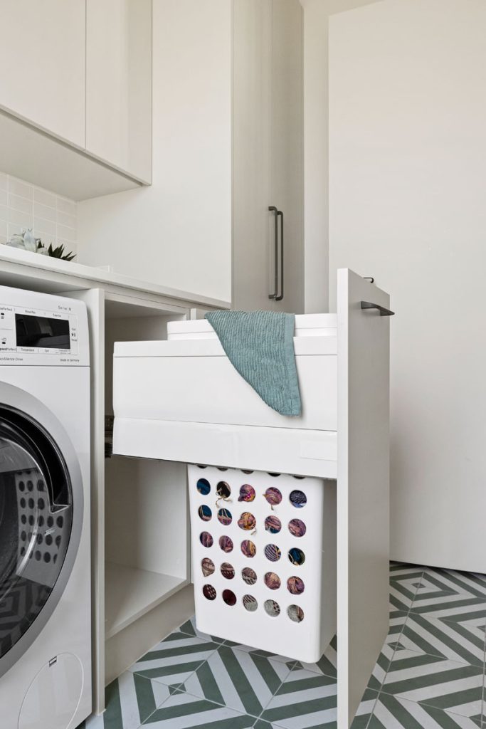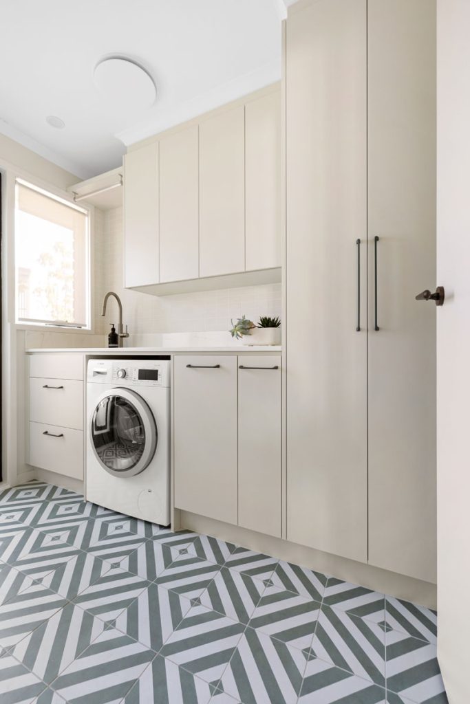 The laundry features diamond-shaped tiles in a soft green hue, adding vibrancy while reinforcing the cohesive color palette found throughout the home. The bathroom transformation introduces Nordic Oak vanities paired with textured linear feature tiles, evoking a sense of calm. Thoughtful storage solutions include a four-bank drawer unit, a slide-out inner storage system, and a soft pendant light that enhances warmth and ambiance.