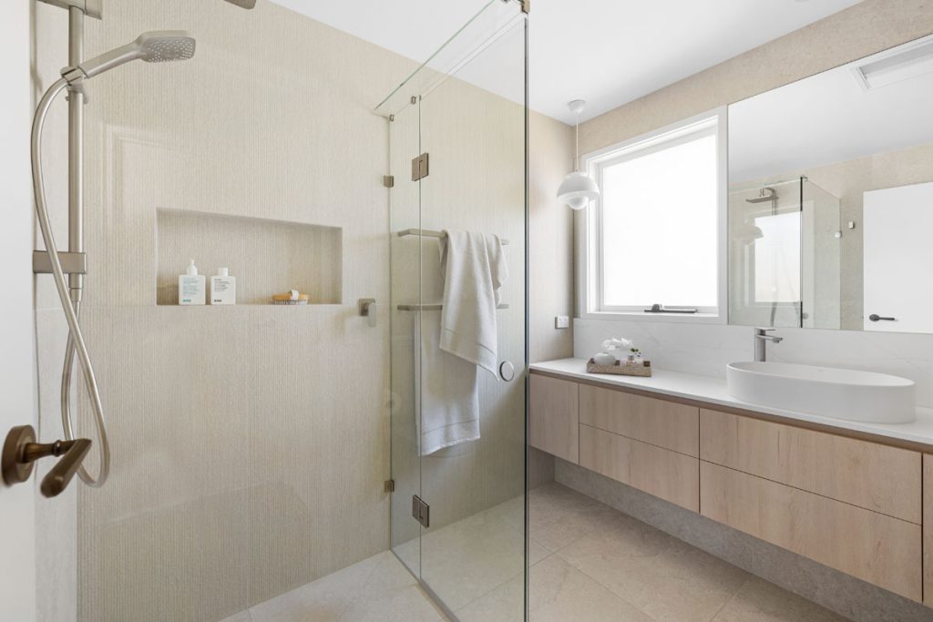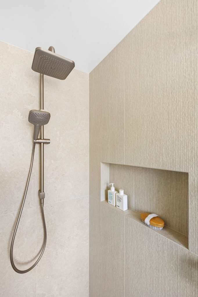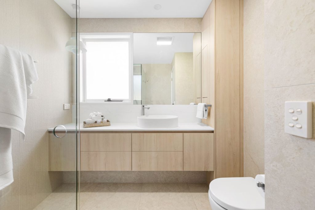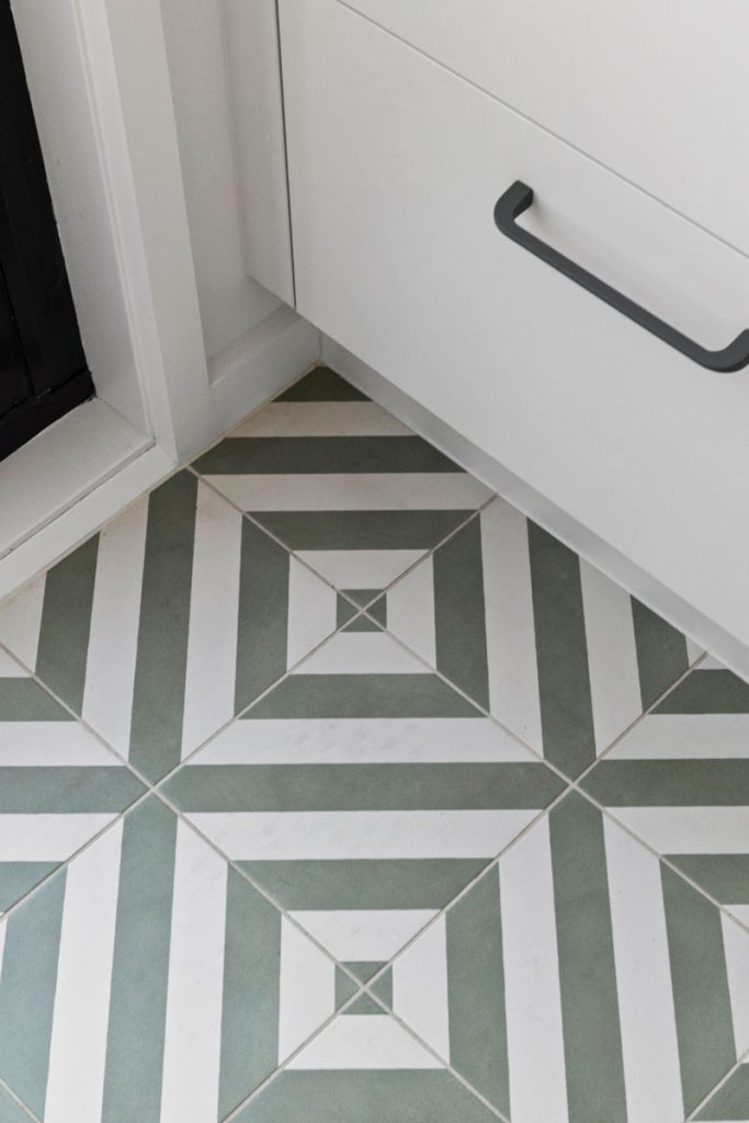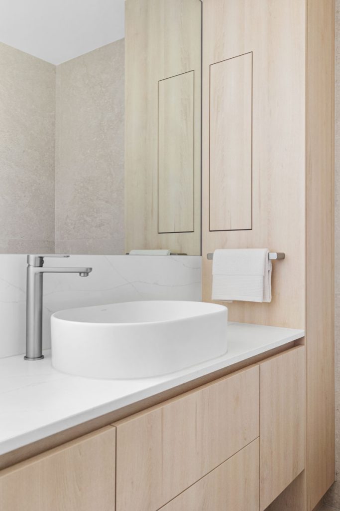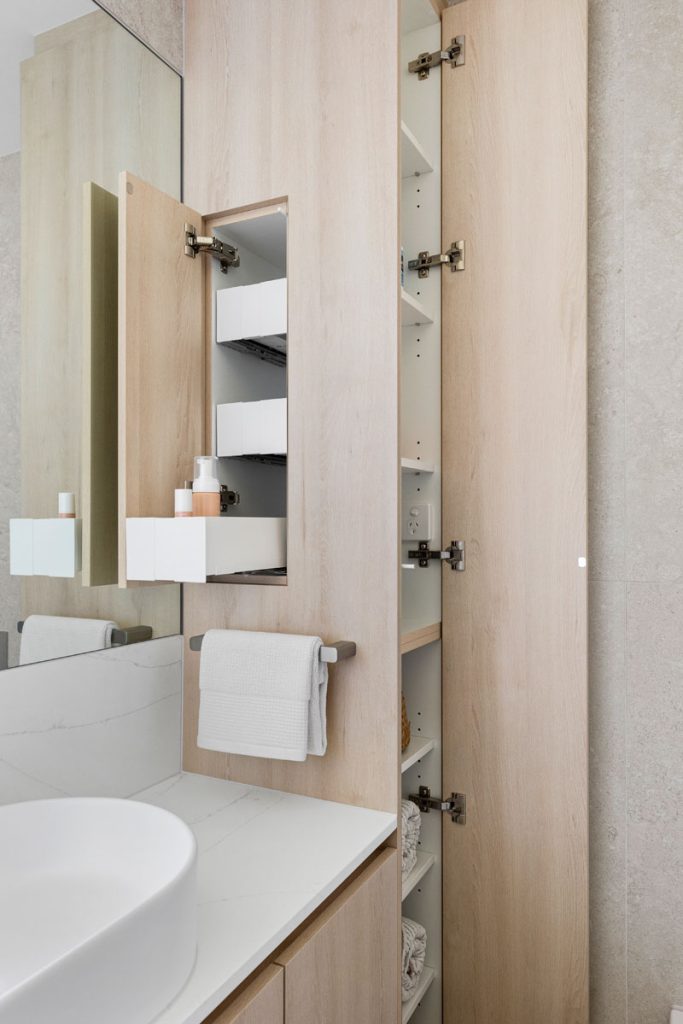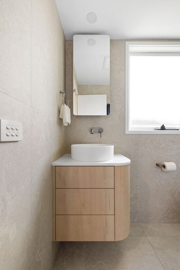 The laundry features diamond-shaped tiles in a soft green hue, adding vibrancy while reinforcing the cohesive color palette found throughout the home. The bathroom transformation introduces Nordic Oak vanities paired with textured linear feature tiles, evoking a sense of calm. Thoughtful storage solutions include a four-bank drawer unit, a slide-out inner storage system, and a soft pendant light that enhances warmth and ambiance.