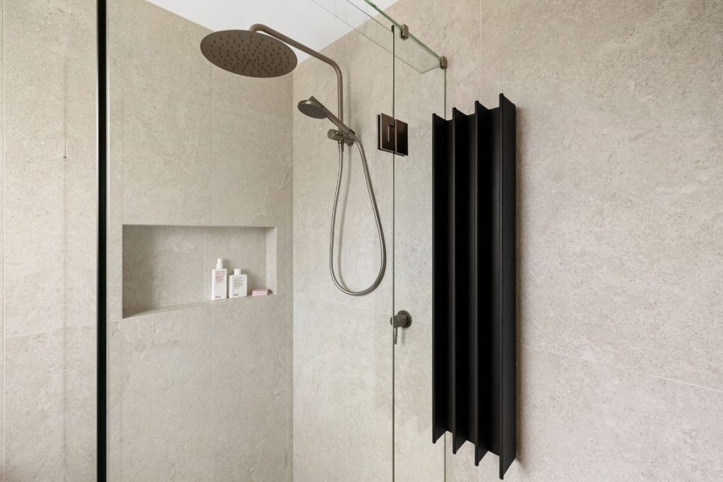 In the ensuite, we echoed the family bathroom’s materials for consistency, featuring a curved vanity, a radius mirrored shaving cabinet, and a half-moon wall light that softens the compact space, transforming it into a private sanctuary. A black vertical heated towel rail adds a functional, industrial edge.