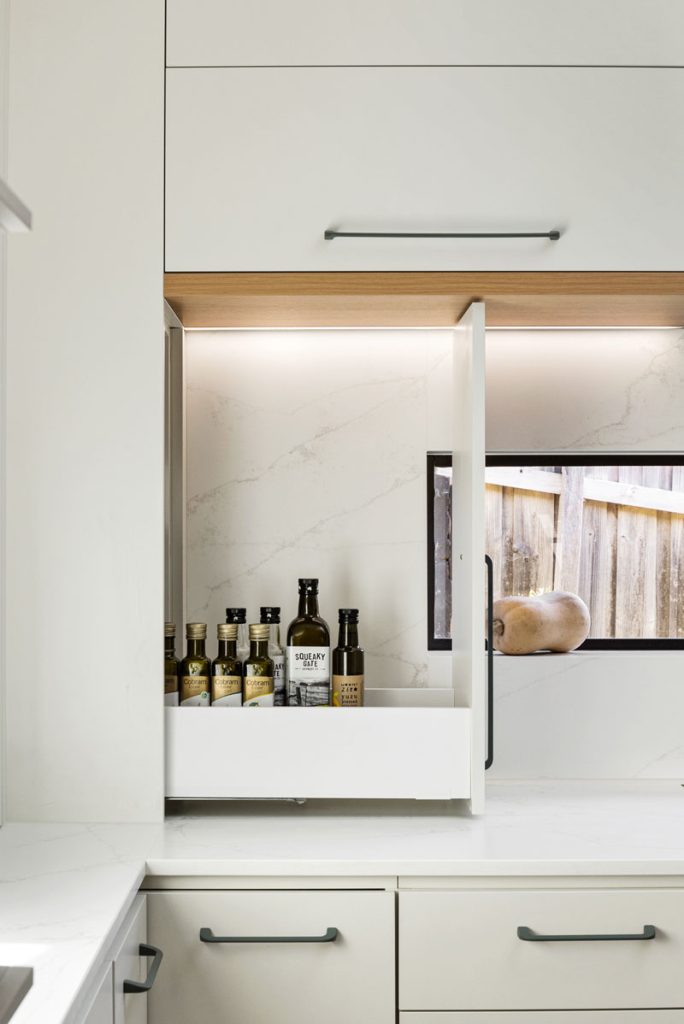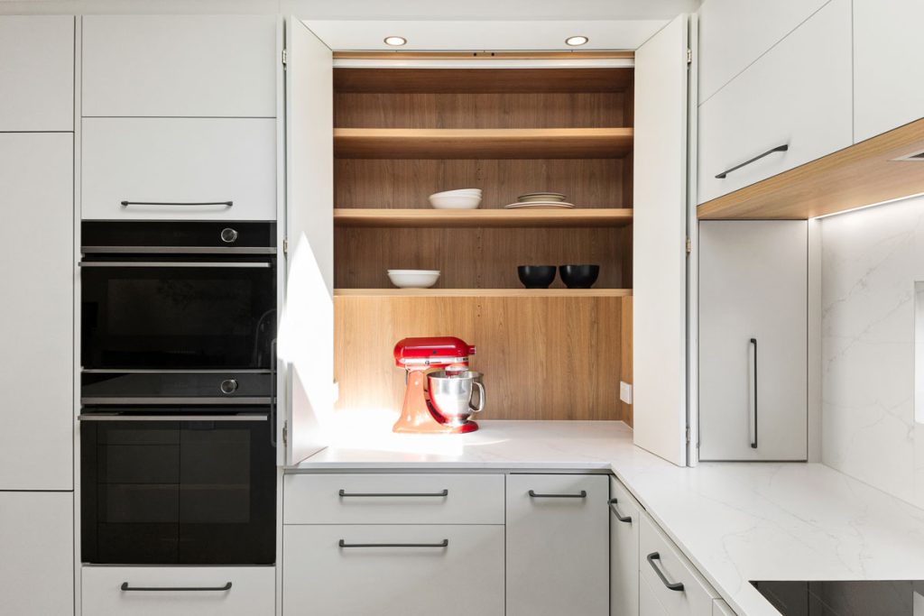 The original kitchen was impractical for everyday cooking, with three corner cabinets creating dead space and an island obstructing natural movement. We streamlined the layout to maximise accessibility, reducing unnecessary corner cabinets and introducing a bi-fold appliance garage to neatly house everyday essentials.