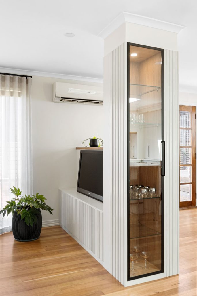 In the living room, an existing structural column posed a unique design challenge. Instead of working around it, we integrated a custom-built multi-purpose unit that cleverly disguises the pillar while serving as a glass display cabinet, an open shelving unit, and a TV stand—seamlessly dividing the space while maintaining visual flow.