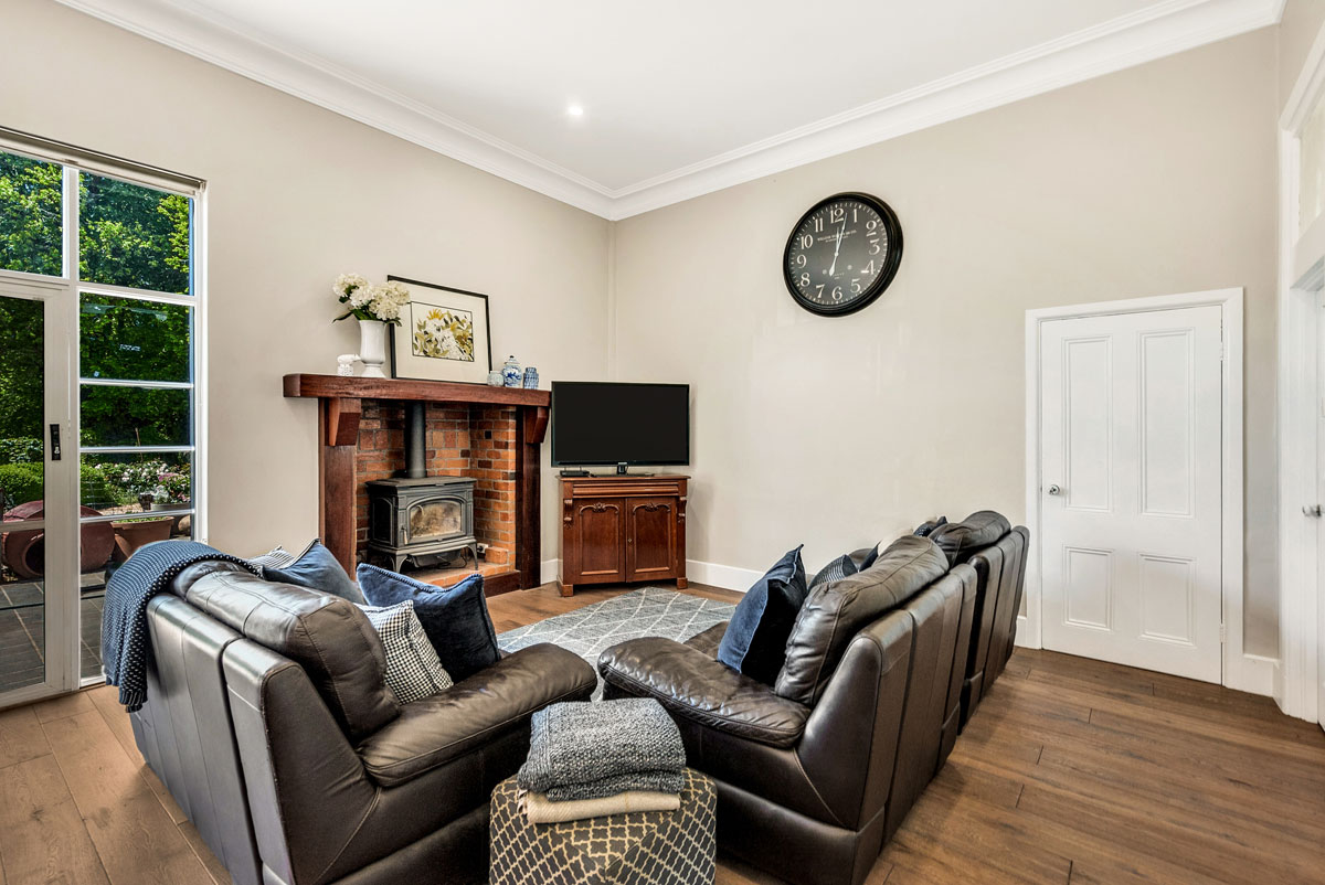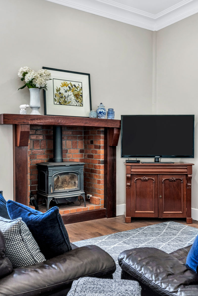 The original layout was reimagined, swapping the living and kitchen from opposite ends of the room, improving traffic flow and allowing an original fireplace to be uncovered. The farmhouse-style kitchen features shaker doors, decorative skirting boards, and capping, blending traditional aesthetics with a functional layout for modern living.
