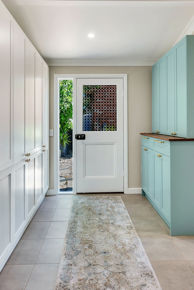 The addition of a walk-in pantry significantly increases storage capacity, while relocating the kitchen creates a designated space for cooking and eliminates unnecessary foot traffic. The mudroom and laundry areas were also enhanced with additional storage, featuring solid red gum benchtops sourced from the property and Caesarstone countertops for practicality.